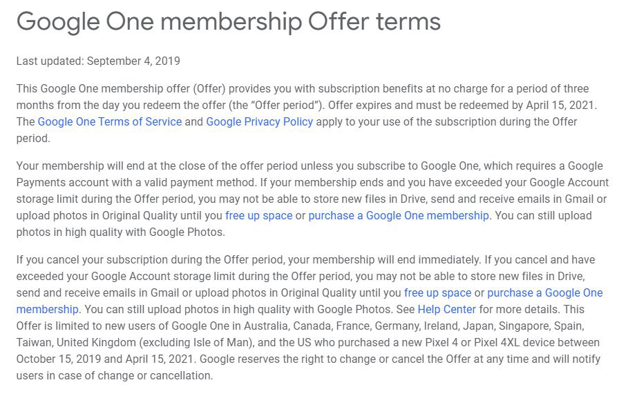 Данное предложение распространяется только на новых пользователей Google One в Австралии, Канаде, Франции, Германии, Ирландии, Японии, Сингапуре, Испании, Тайване, Великобритании (за исключением острова Мэн) и США, которые приобрели новый Pixel 4 или Pixel 4XL с 15 октября 2019 года по 15 апреля 2021 года. Предложение действительно до 15 апреля 2021 года