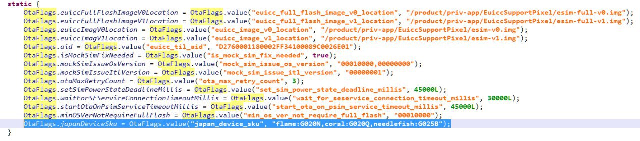 Ниже скриншот класса OtaFlags в приложении EUICCPixelSupport