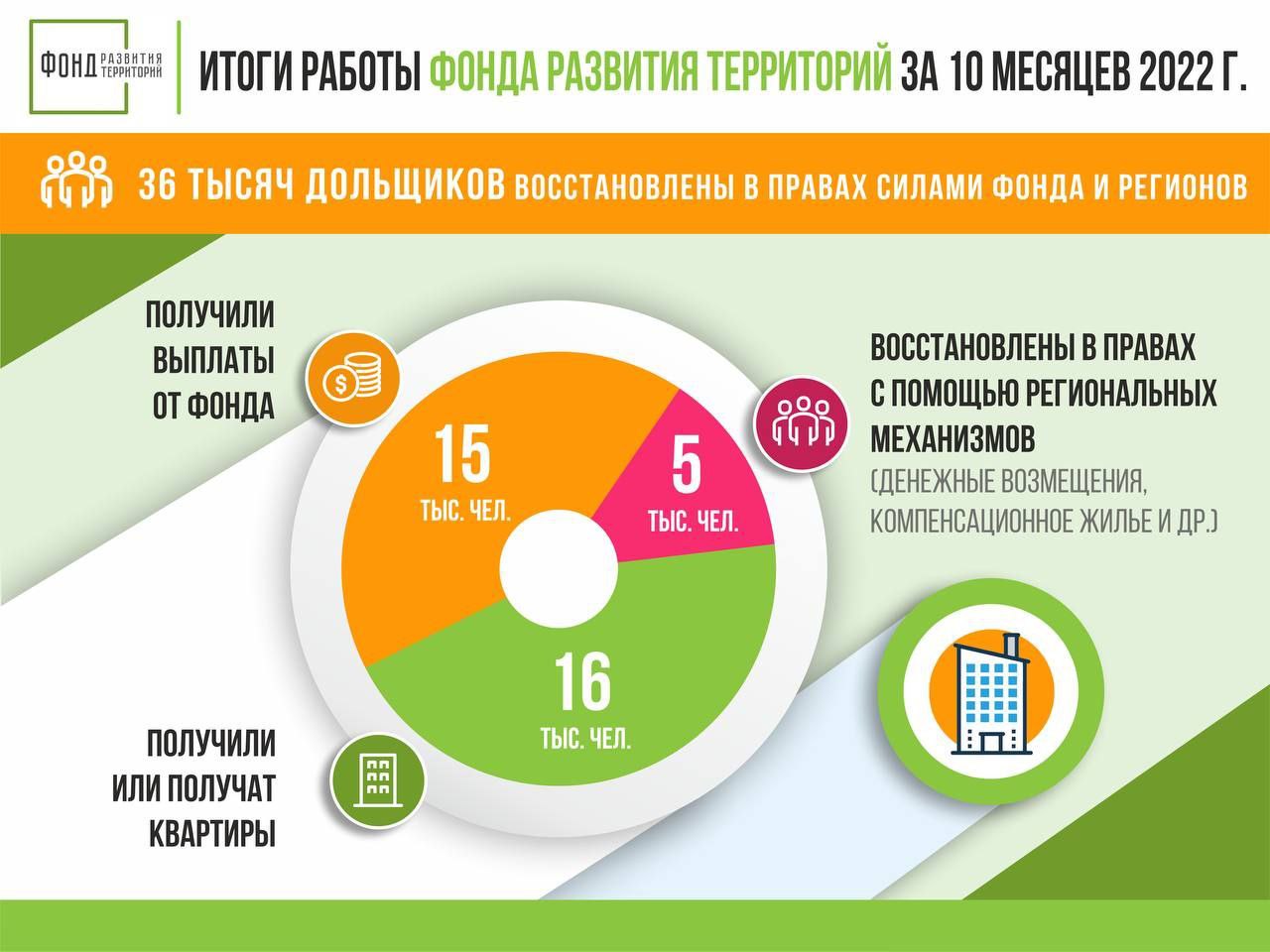 Фонд развития территорий pinned «#ЦифраДня 📌 36 тысяч российских дольщиков восстановлены в правах за 10 месяцев этого года. «За период с 1 января по 31 октября Фонд развития территорий и субъекты в рамках своих «дорожных карт» восстановили права 36 тысяч человек. Люди получили либо квартиры…»