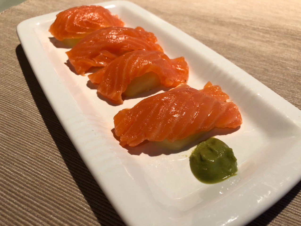 Если разрезать его пополам, то некоторые половинки образуют типичные формы, которые обретает рис в руках мастера суши. Я положил их на тарелку, сверху нарезал форели и аккуратно накрыл ей малышей.