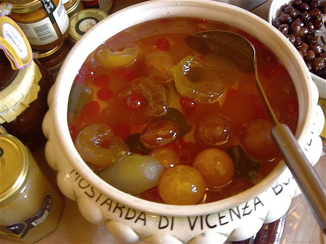 Если слово «мостарда» напомнило вам английское mustard, то школа прошла не зря. Кондимент готовится как варенье. Сначала фрукты проходят стадию мацерации (maceration), то есть лежат в сахаре и отдают свои соки, превращая всё в сироп. Затем этот сироп готовится с вином, лимонным соком и горчицей, а после им заливают фрукты.