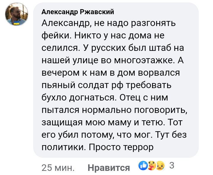 «Александр, не надо разгонять фейки. Никто у нас дома не селился. У русских был штаб на нашей улице во многоэтажке. А вечером к нам в дом ворвался пьяный солдат рф требовать бухло догнаться. Отец с ним пытался нормально поговорить, защищая мою маму и тётю. Тот его убил потому, что мог. Тут без политики. Просто террор».