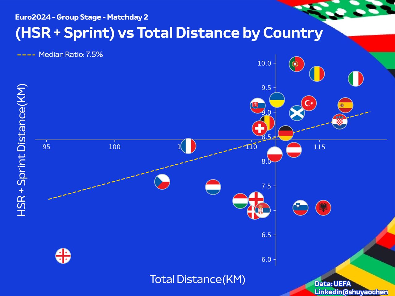 Интересно, что даже среди группы с низким пробегом и низкой интенсивностью, пробег Грузии был заметно самым низким, а их пробег на высокой интенсивности за игру был почти на 40% меньше, чем у Португалии. Однако это не означает, что грузинские игроки на 40% менее физически подготовлены, чем португальские. Большое количество пробега на высокой интенсивности часто указывает на частые транзишены. Поскольку Грузия большую часть матча находилась в низком блоке, их игроки редко участвовали в пробегах на высокой интенсивности и действиях на больших пространствах, что является следствием тактического стиля игры.