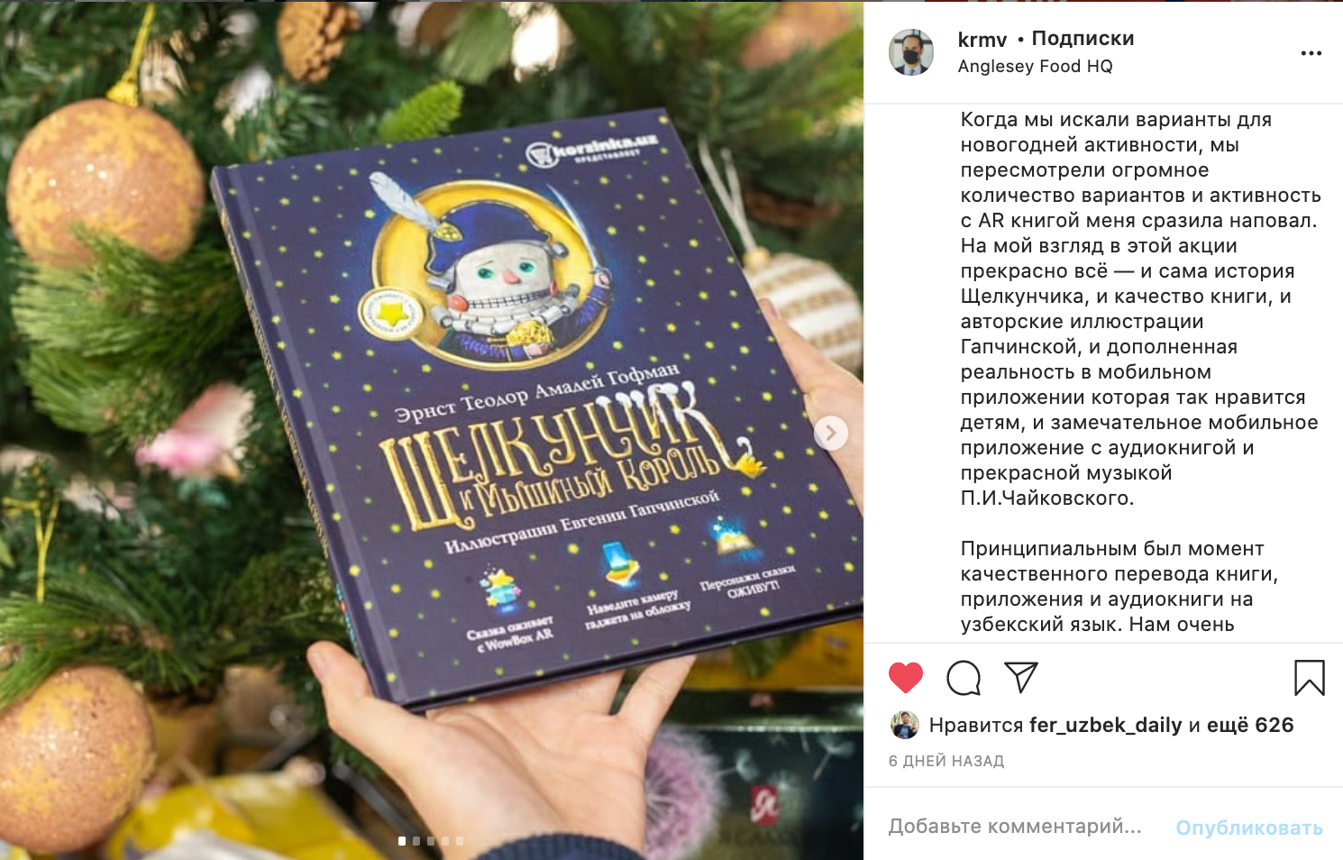 К новому году Korzinka.uz выпустила книгу с дополненной реальностью «Щелкунчик и Мышиный король». Книгу перевели на узбекский. Также доступна аудиокнига на русском и узбекском языках.