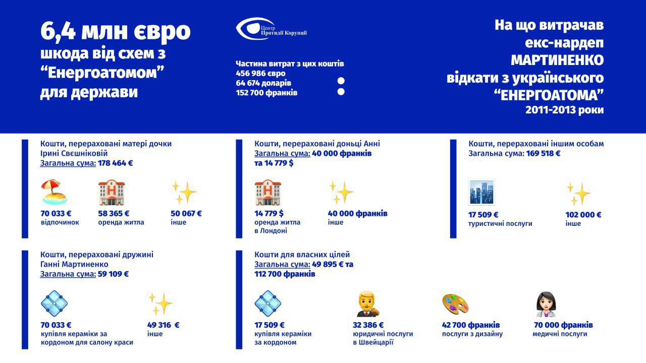 На інфографіці можете побачити, на що витрачалися розкрадені на «Енергоатомі» кошти: