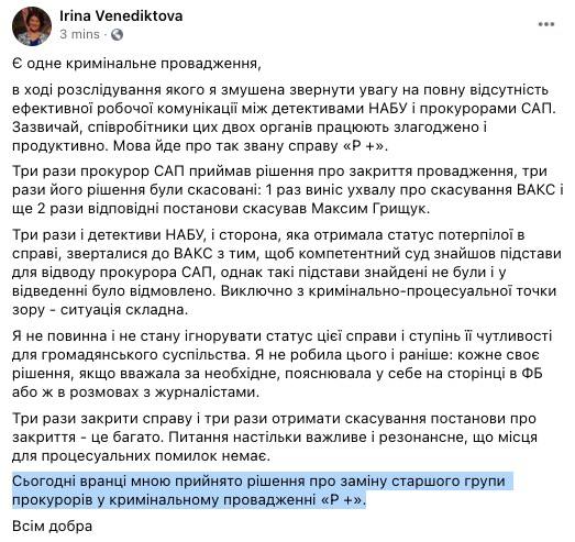 Венедіктова весь час пручалася і вигадувала неймовірні відмазки, чому Пономаренка не заміняли раніше. Тут ми описували цю істерію: https://t.me/fuckcorruption/935