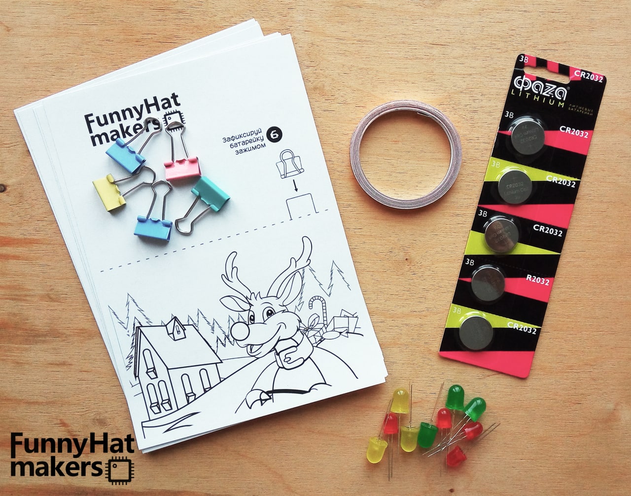 Основой моих наборов является медная самоклеящаяся лента. Один её слой токопроводящий, второй покрыт клеем и плохо проводит ток. Если к ленте подключить источник питания и радиоэлементы, то можно подать на них питание как по проводам. В этом вся "фишка" ленты — не надо зачищать провода, сидеть с паяльником, ломать голову над макетной платой. Плюсом является и отсутствие высокого напряжения -- большую часть элементов можно питать напряжением до 5 вольт. Т.е. работа с лентой безопасна, стоит только внимательно следить за радиодеталями. При желании её можно даже лизнуть, но это при желании :)