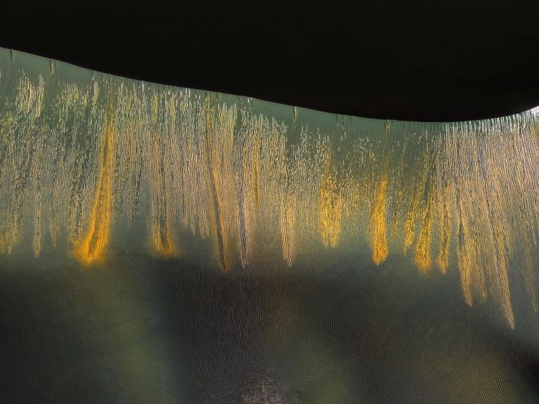 А на снимке действительно были марсианские дюны. Под лучами солнца испарился намерзший углекислый газ и проступили минералы. Это кратер Кайзера. Снимок MRO: