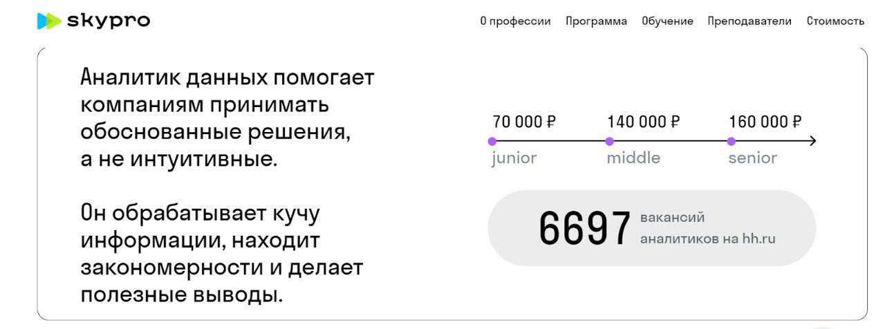 Результат: в конце курса вы станете уверенным junior-аналитиком и сможете найти первую работу в IT на зарплату от 70.000₽