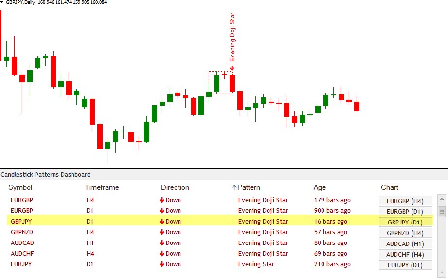 Candlestick Dashboard spends just a few seconds to find candle patterns and displays them all in the table below the chart. You do not need to run around a lot of chart s, you can scan simply by switching to the desired pair and the time frame in the table.