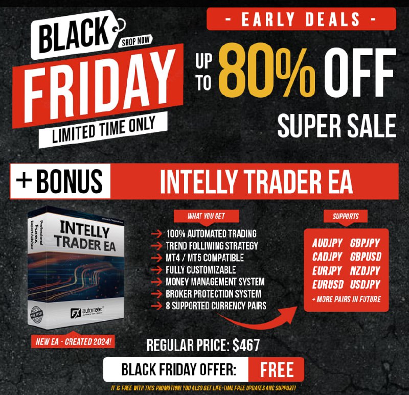 In addition to a HUGE DISCOUNT you will get INTELLY TRADER EA or another EA (available for CRIPTO) of your choice for FREE.