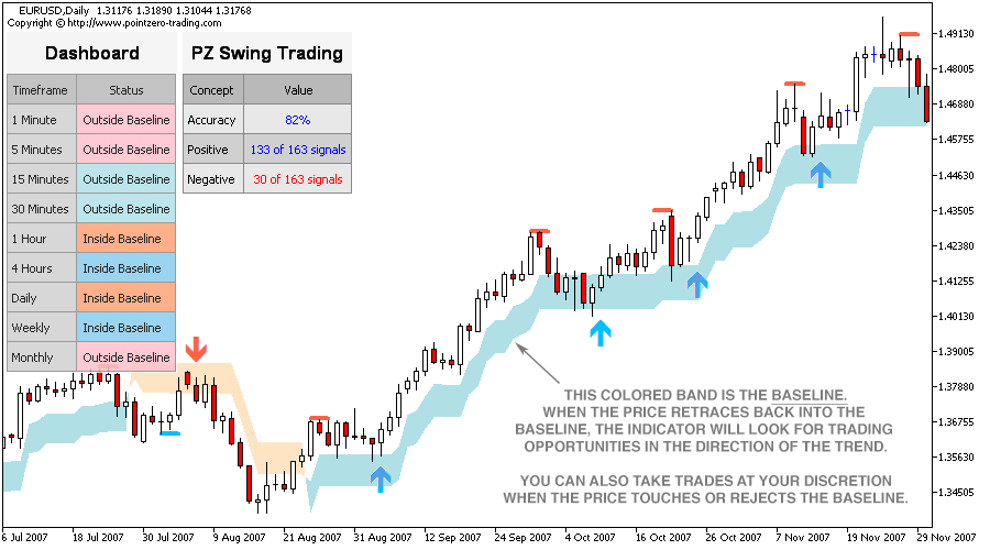 Swing Trading is the first indicator designed to detect swings in the direction of the trend and possible reversal swings. It uses the baseline swing trading approach, widely described in trading literature. Its winning ratio is around 80%.