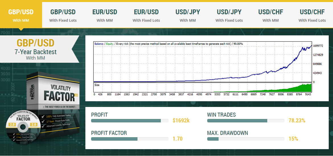 Volatility Factor EA is specialized EA designed to deliver 10-15+ pips per trade. It is based on a very powerful volatility-based market algorithm that has been put through a battery of real-world tests.