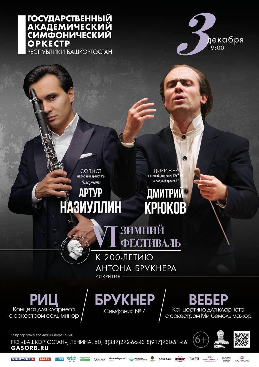 🎶 3 декабря, на открытии Фестиваля, в качестве солиста выступит известный российский кларнетист, народный артист РБ Артур Назиуллин, а во второй части концерта прозвучит седьмая симфония великого композитора Антона Брукнера.