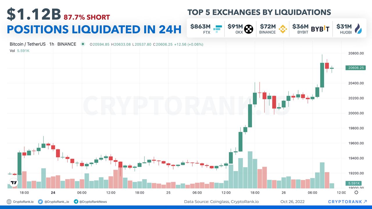 Due to the recent Bitcoin rise above $20,500 about $1.12 billion in longs and shorts was liquidated from the leading derivatives exchanges: