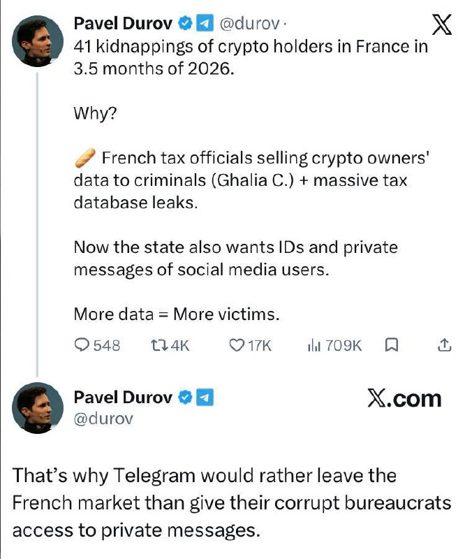Вот почему Telegram предпочел уйти с французского рынка, чем предоставить своим коррумпированным чиновникам доступ к личным сообщениям".