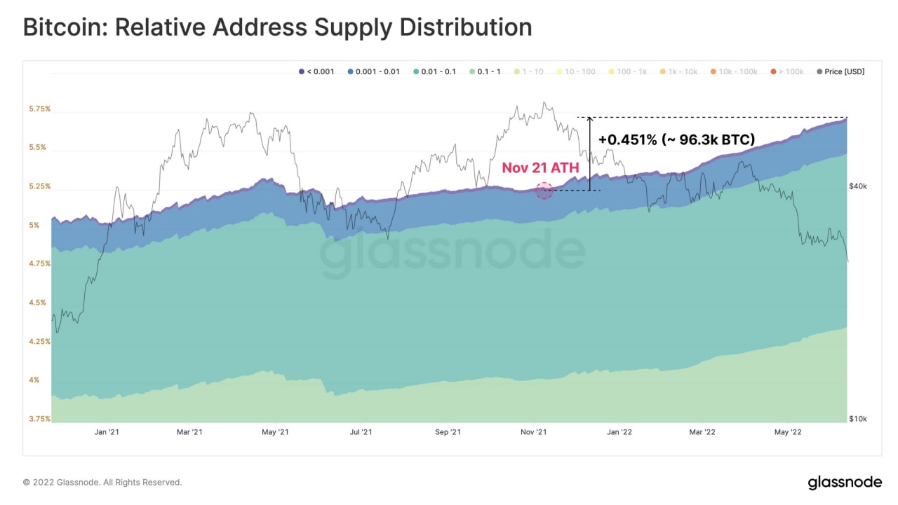 Согласно данным Glassnode, прямо сейчас количество биткоинов увеличивается на кошельках с суммами от 1 до 10 BTC. Возможно они потеряли страх, фанатизм или что-то знают.