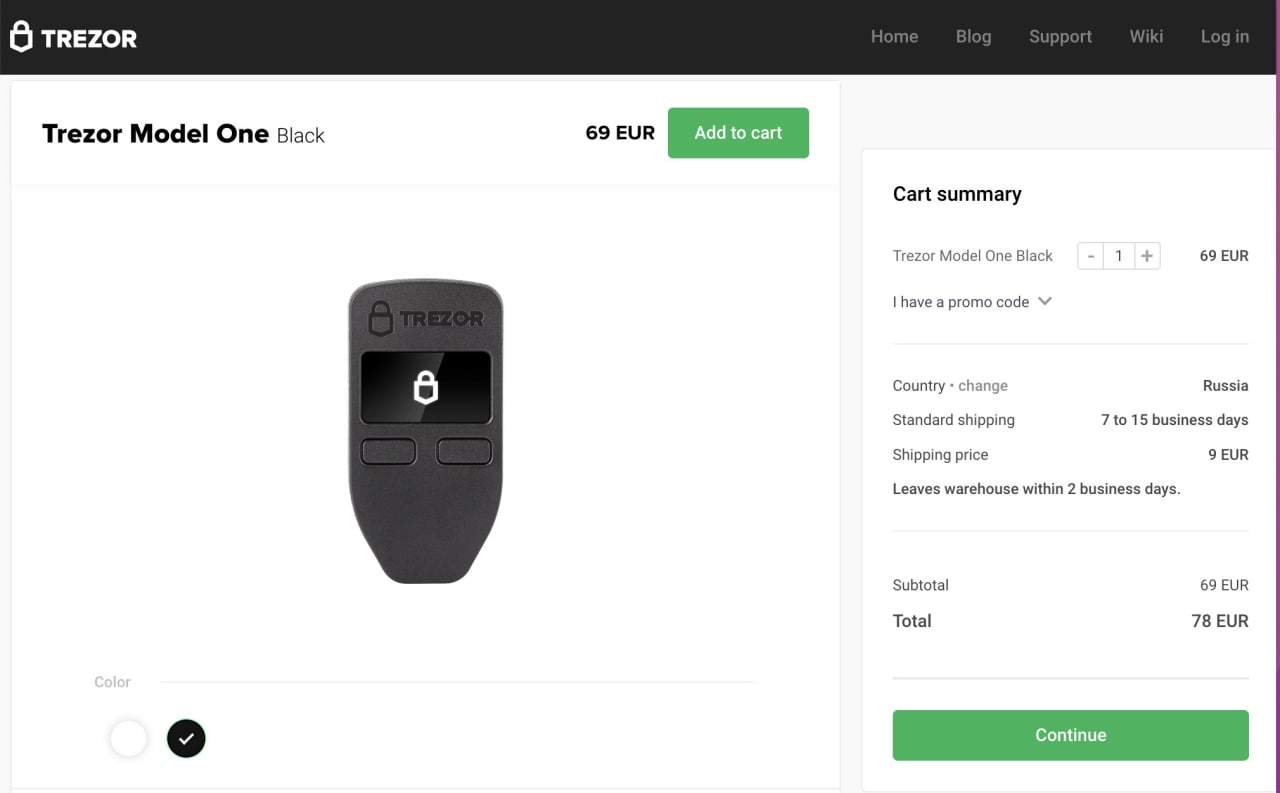 Теперь вы получите официальный безопасный кошелек Trezor Model One за 69 Евро плюс доставка 9 Евро. Всего такая покупка вам обойдется в 78 Евро, что в пересчете на биржевой курс равно 5 тыс рублей.