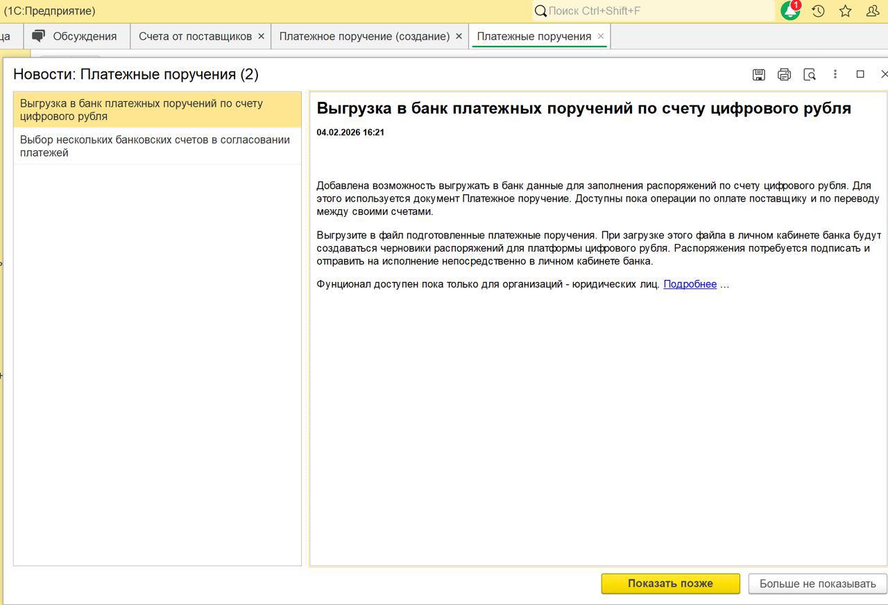 1С:Бухгалтерия в 2025 году получила возможность учитывать счета крипторубля, а с 4 февраля 2026 добавлена возможность выгружать в банк данные для заполнения распоряжений по счету цифрового рубля.