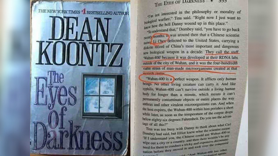 Вчера прислали ссылку на книгу, вышедшую в США в 1981 году. Называется The Eyes of Darkness (Глаза тьмы). Автор Дин Кунц. Там описывется факт создания вируса Ухань-400, который создали ученые китайской секретной лаборатории, расположенной в пригороде Ухани. Один ученый сбежал в США и рассказал об этом биооружии американским спецслужбам. Вот цитата оттуда: