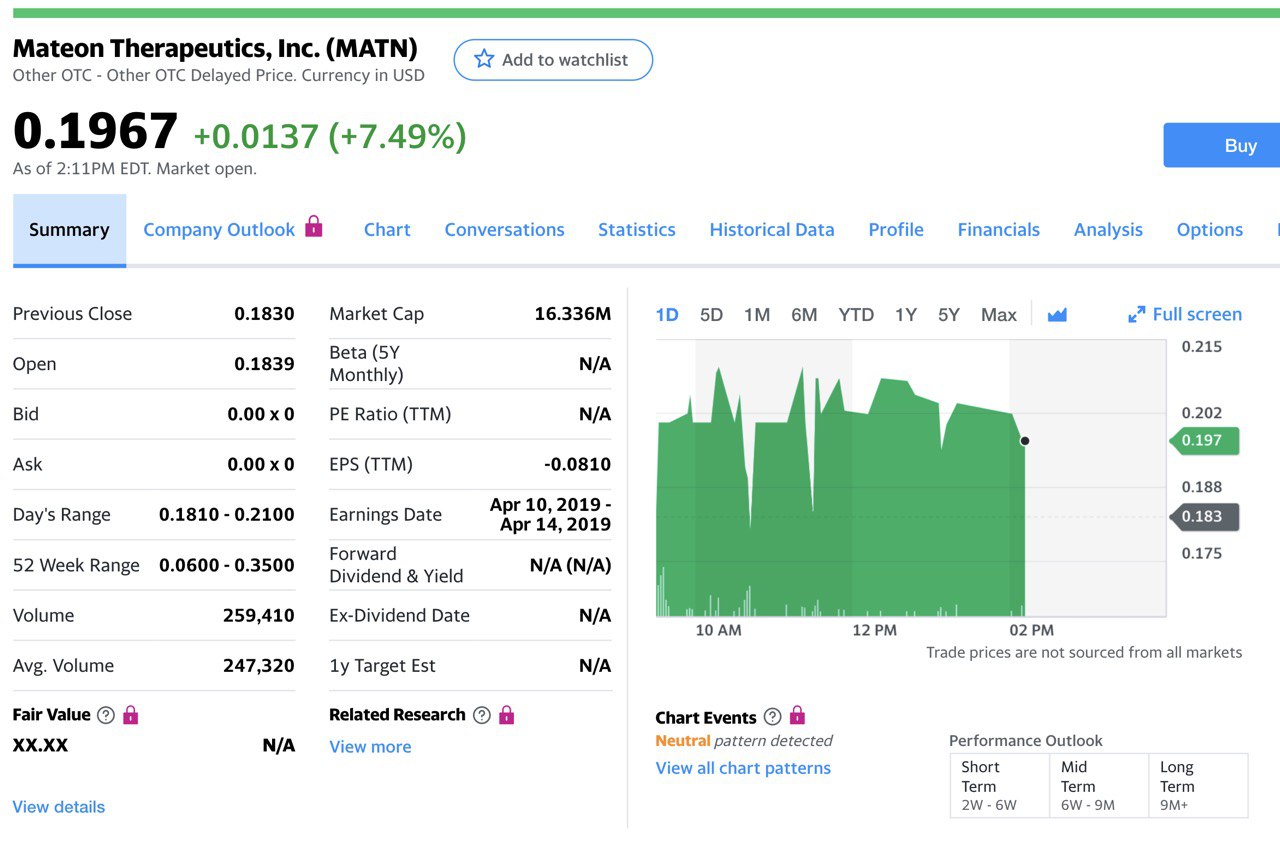 И в связи с этим есть неплохая возможность заработать на акциях Matheone, стикер MATN. Поскольку их препарат сейчас будет широко применяться для лечения инфицированных. Если внимательно посмотреть на график цены этих бумаг, то их не постигла участь других акций во время нынешнего кризиса. Они не падали совсем.