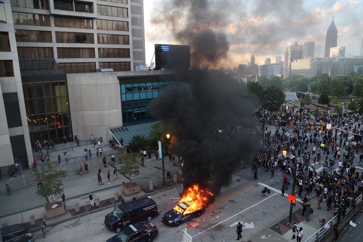 В Джорджии объявлено чрезвычайное положение. В Атланте мэр заявил о начале хаоса. Толпа побила полицейские машины и окна штаб-квартиры CNN - главного фэйк-ньюз агентства США по версии Трампа. Полиция использует слезоточивый газ.