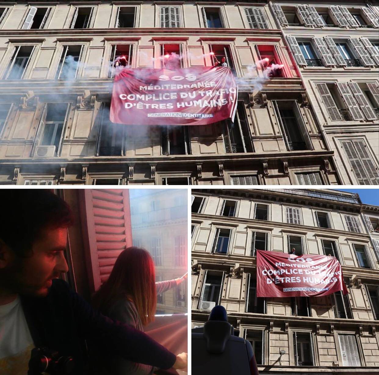 Depuis 14 heures, Génération Identitaire occupe les locaux de « SOS Méditerranée » à Marseille où ses militants ont déployé une grande banderole « SOS Méditerranée complice du trafic d’êtres humains ».