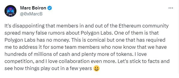 👌 СЕО Polygon Labs Марк Бойрон пишет, что его разочаровывают ложные слухи, распространяемые членами сообщества Ethereum о том, что у Polygon Labs нет денег.
