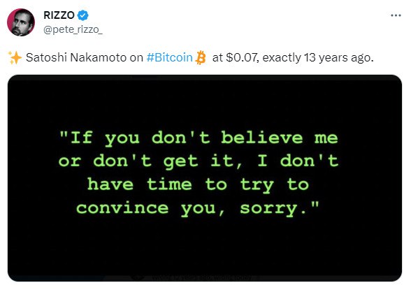 😇 Легендарная цитата Сатоши Накамото, сказанная 13 лет назад при цене биткоина $0,07!
