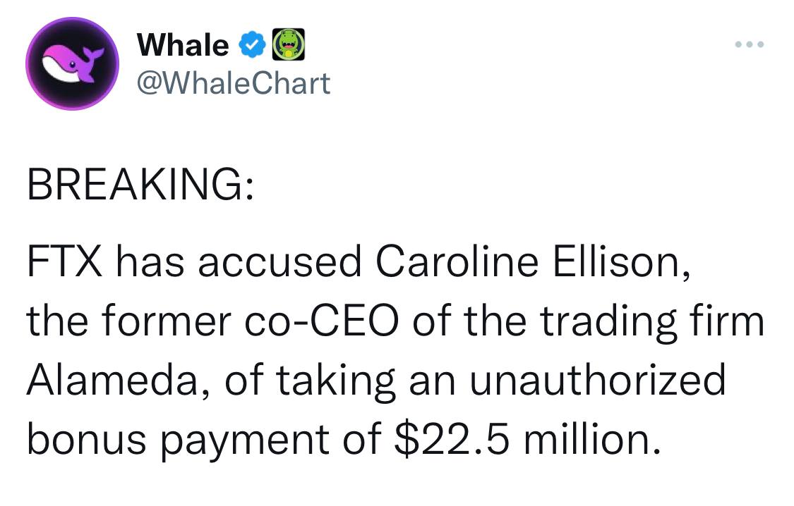 🚨 FTX обвинила Кэролайн Эллисон, бывшего генерального директора Alameda, в получении несанкционированной бонусной выплаты в размере 22,5 млн долларов.
