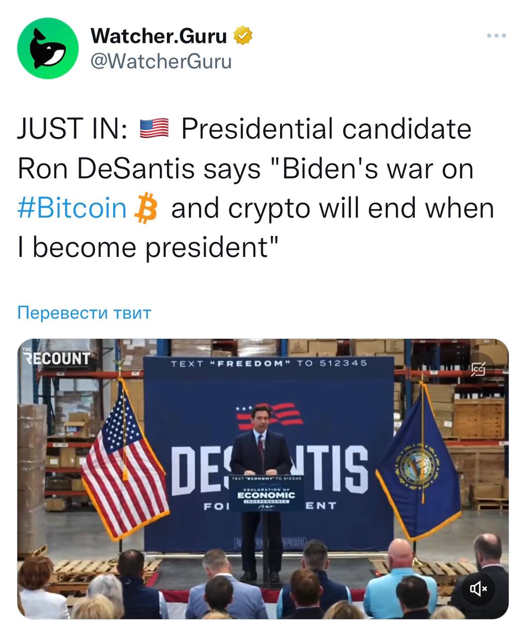 🇺🇸 Кандидат в президенты Рон ДеСантис: «Война Байдена с биткоином и криптой закончится, когда я стану президентом»
