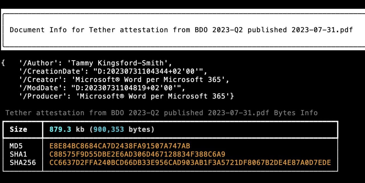 В метаданных аттестации Tether указано, что документ был создан «Тэмми Кингсфорд-Смит»