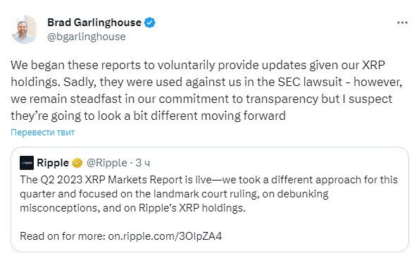 Глава Ripple Брэд Гарлингхауз пишет, что SEC воспользовались их отчетами для судебного дела, однако это не изменит их позиции и они продолжат отчитываться 👌