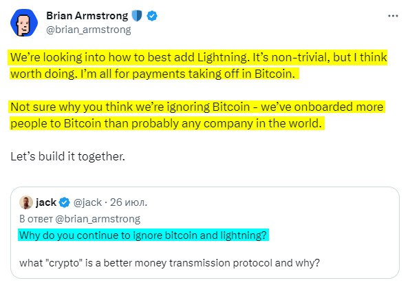 ⚡️Глава Coinbase Брайан Армстронг ответил Джеку Дорси на вопрос, почему они игнорируют Bitcoin и платежную систему Lightning