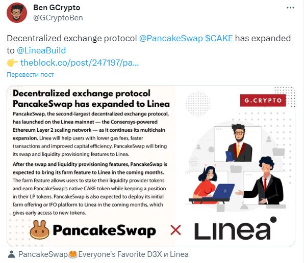 ⛓ Протокол децентрализованного обмена PancakeSwap запущен теперь и на блокчейне Linea