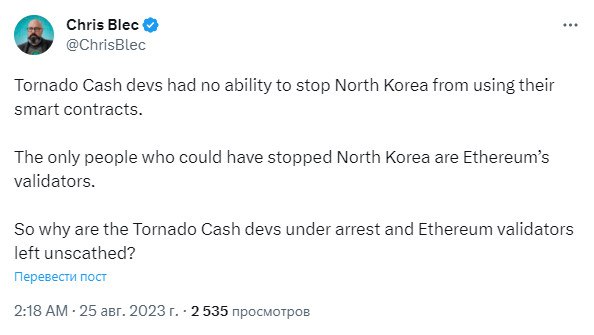🤔 "Разработчики Tornado Cash не имели возможности помешать Северной Корее использовать свои смарт-контракты.
