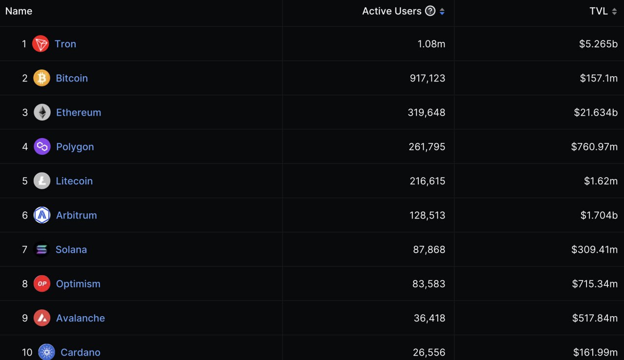 ⛓Tron — самый используемый блокчейн в мире, если рассматривать сети через показатель количества активных пользователей