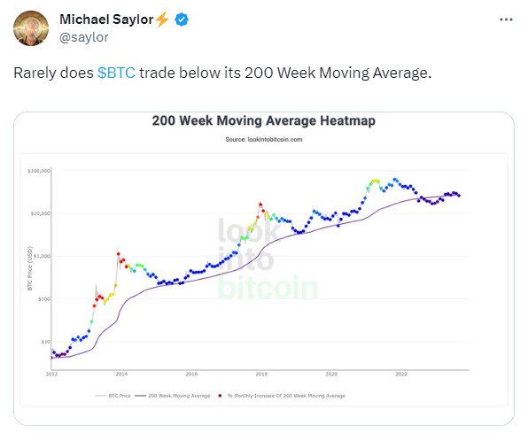 😃 Доброе утро от Майкла Сейлора, который напоминает всем о том, что биткоин крайне редко торгуется ниже своей 200-недельной скользящей средней