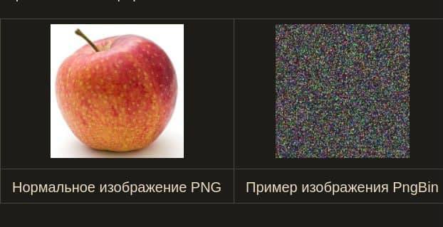Изображение, созданное PngBin, будет иметь все свойства, как и обычное изображение PNG, за исключением того, что при просмотре оно будет выглядеть сломанным и зашумленным