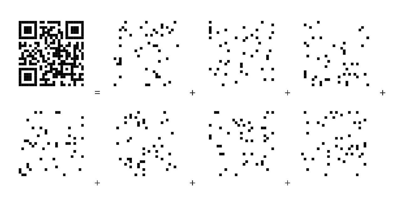 Разделив QR-код на 7 фрагментов, мы можем физически разделить и распространить секрет в реальном мире. Например, распечатав фрагменты QR на прозрачной бумаге и раздав их нескольким людям
