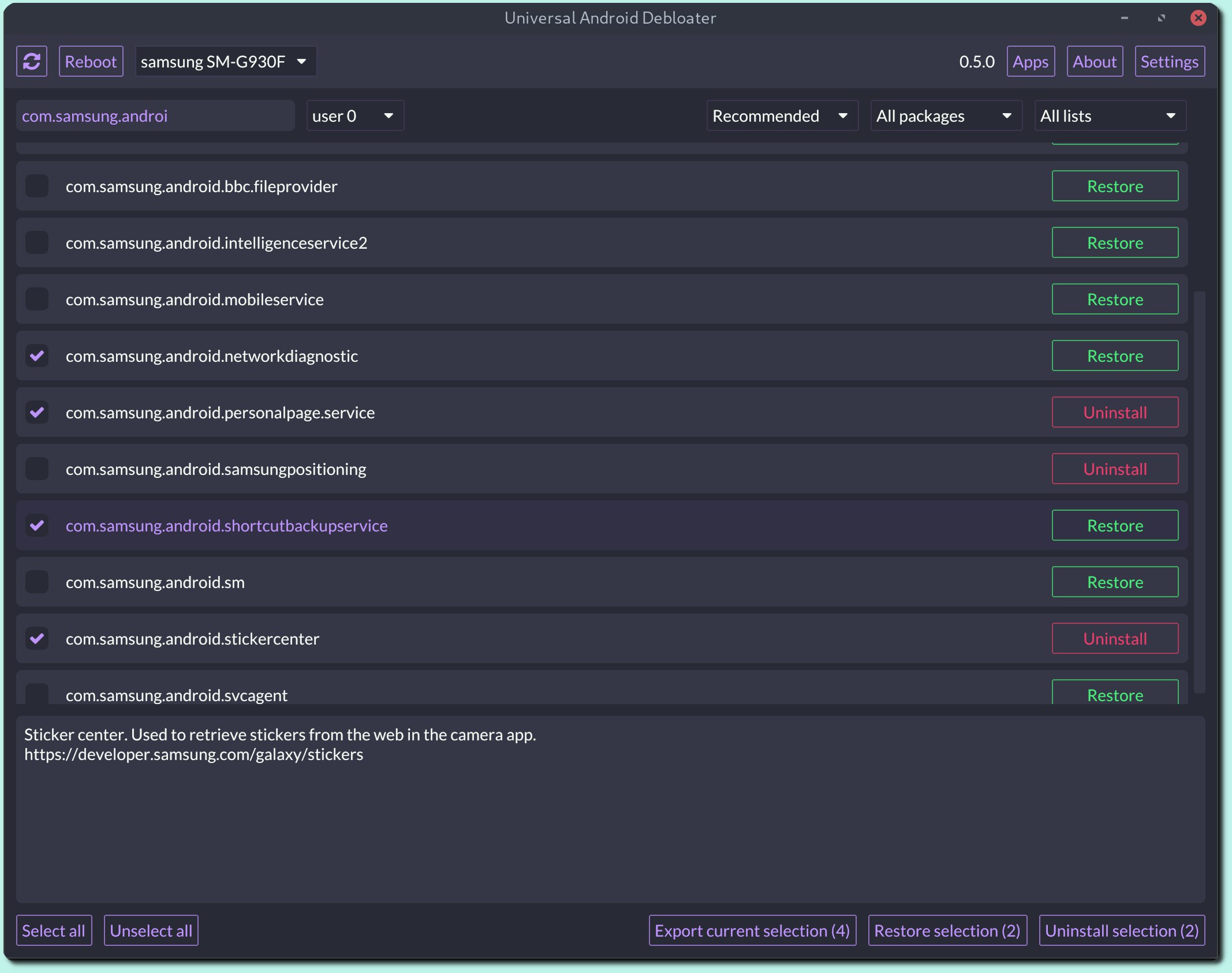 Universal-Android-Debloaterкросс-платформенный графический интерфейс для удаления, замораживания, отключения и переустановки системных приложений на Android без рут прав