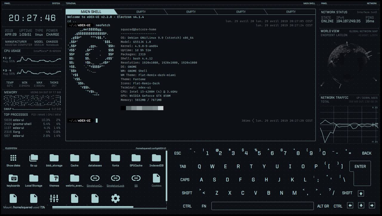 eDEX-UI - это полноэкранный кроссплатформенный эмулятор терминала с расширенным мониторингом, который выглядит и ощущается как научно-фантастический компьютерный интерфейс