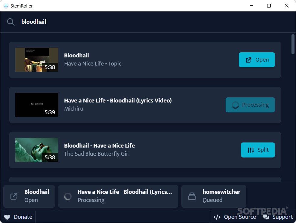 Просто введите название песни в строку поиска – StemRoller найдет песню в YouTube и разделит ее на четыре группы: вокал, ударные, бас и все остальное