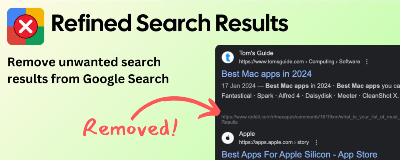 Refined Search Results — это расширение Chromium для удаления нежелательных доменов из результатов поиска Google.