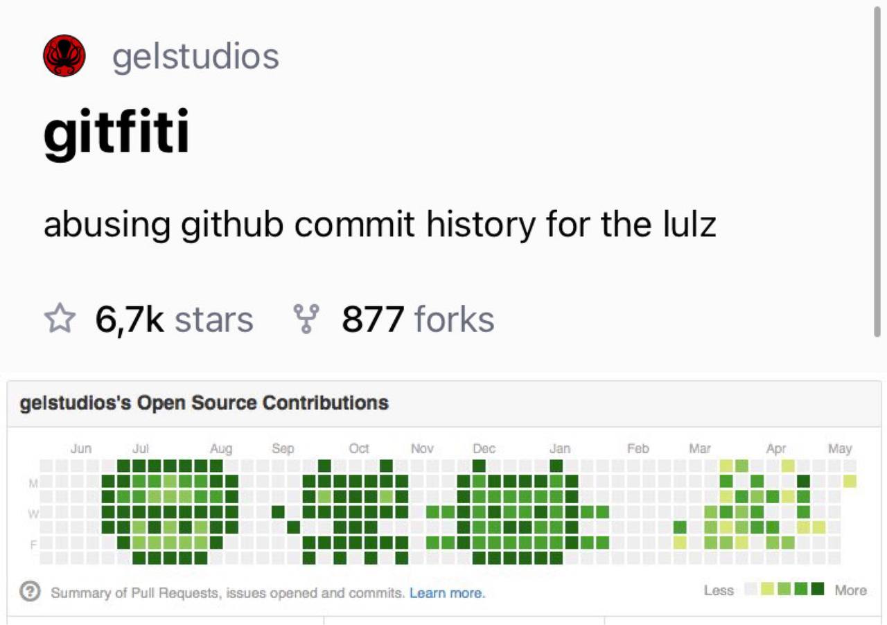 Поскольку это, вероятно, приведет к скопу истории репозитория, настоятельно рекомендуется создать новый репозиторий github при использовании gitfiti. Кроме того, сгенерированный сценарий предполагает, что вы используете аутентификацию с открытым ключом с git.