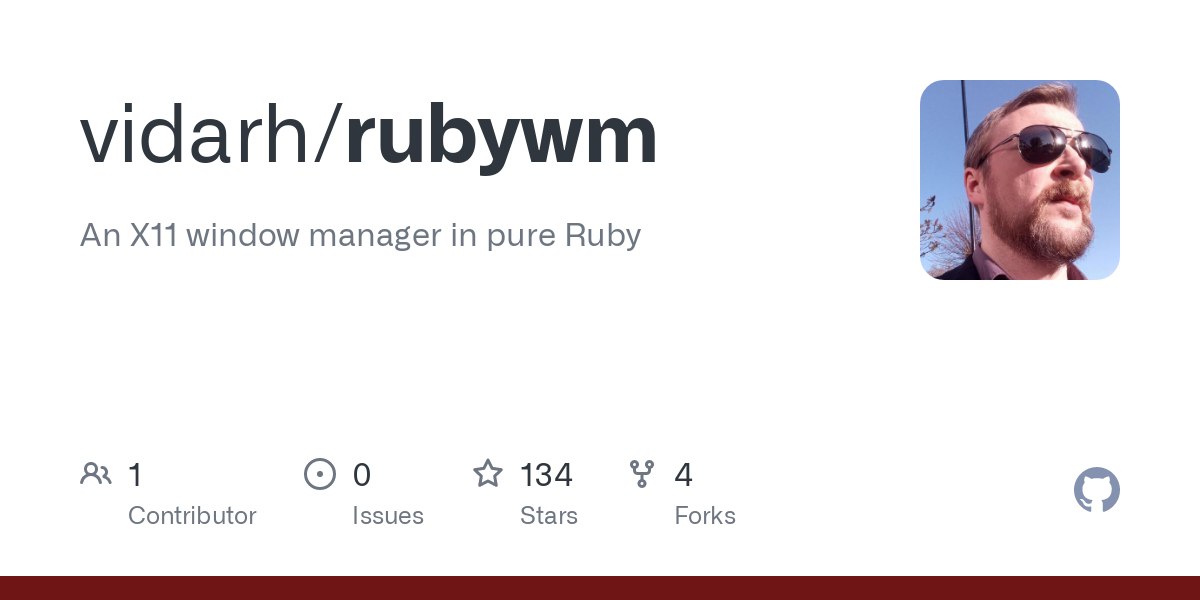 rubywm — оконный менеджер на базе протокола X11, написанный на языке Ruby, включая драйвер для работы с протоколом X11.