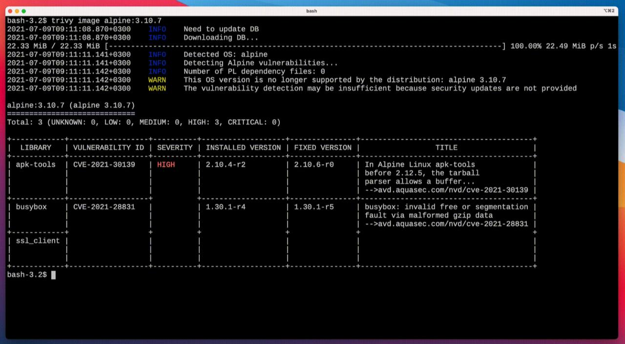 Trivy обнаруживает уязвимости пакетов ОС (Alpine, RHEL, CentOS и т. д.) и языковых пакетов (Bundler, Composer, npm, yarn и т. д.). Кроме того, Trivy сканирует файлы Infrastructure as Code (IaC), такие как Terraform, Dockerfile и Kubernetes, чтобы обнаружить потенциальные проблемы конфигурации