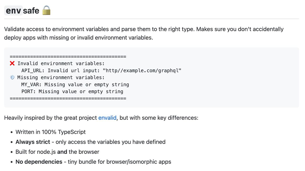 envsafe – библиотека для Node.js, которая помогает верефицировать и провалидировать переменные среды