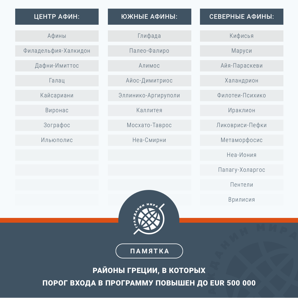 - В большинстве муниципалитетов Афин, Салоник и островов Миконос, Санторини и Парос сумма удвоится до EUR 500 000 (см. список).