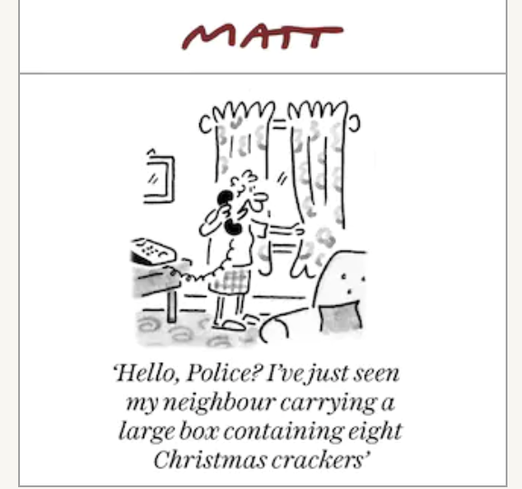 Подпись к карикатуре: "Алло, полиция? Я только что видела, как мой сосед нес большую коробку с восемью рождественскими хлопушками".